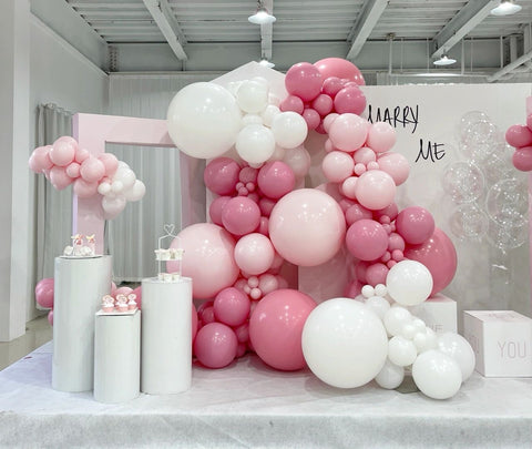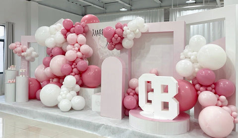 This is a predominantly pink scene, with three main colours. To make the overall colours more harmonious, we have used a combination of sets and single balloons for the balloon colours, with the white and macaron pink sections being single balloons, and the other coral pink being obtained from the macaron pink over the large red. The overall colour is also a gradient concept, with the pink tones slowly transitioning in and out of enhancement and diminution, giving the overall arrangement an alternating light and dark look.